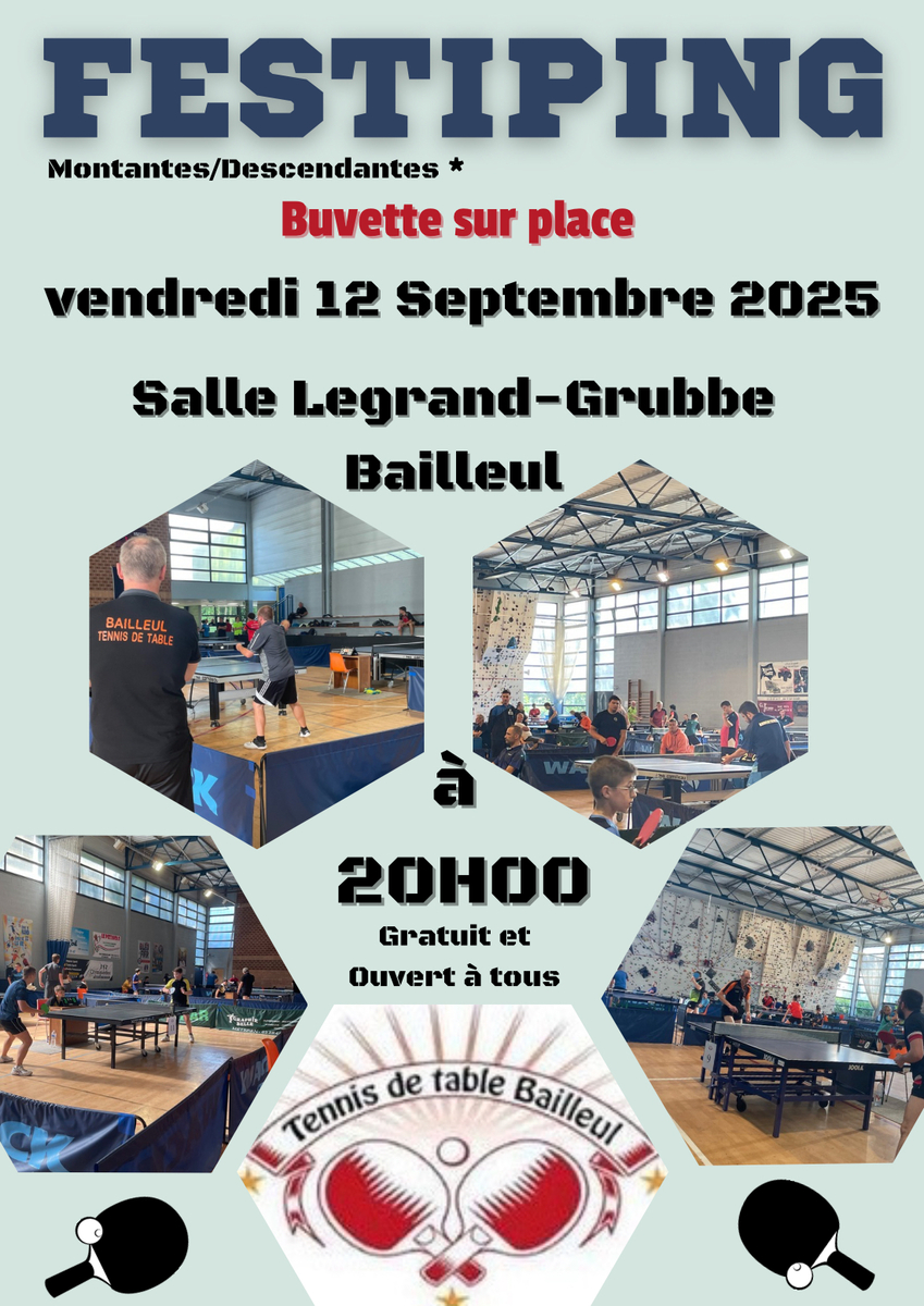 Nous vous invitons à la nouvelle édition du Festi-Ping le 12 Septembre 2025 à partir de 20h30 (inscription à 20h) à la salle Legrand Grubbe, rue Pierre de Coubertin à Bailleul.